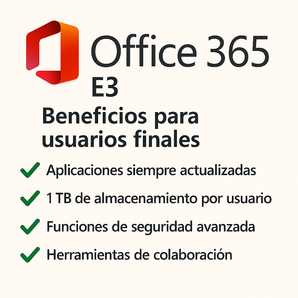 Plan empresarial Office 365 E3 con apps de escritorio (Word, Excel, Outlook), email 100 GB, 1 TB OneDrive y Teams para colaboración segura.